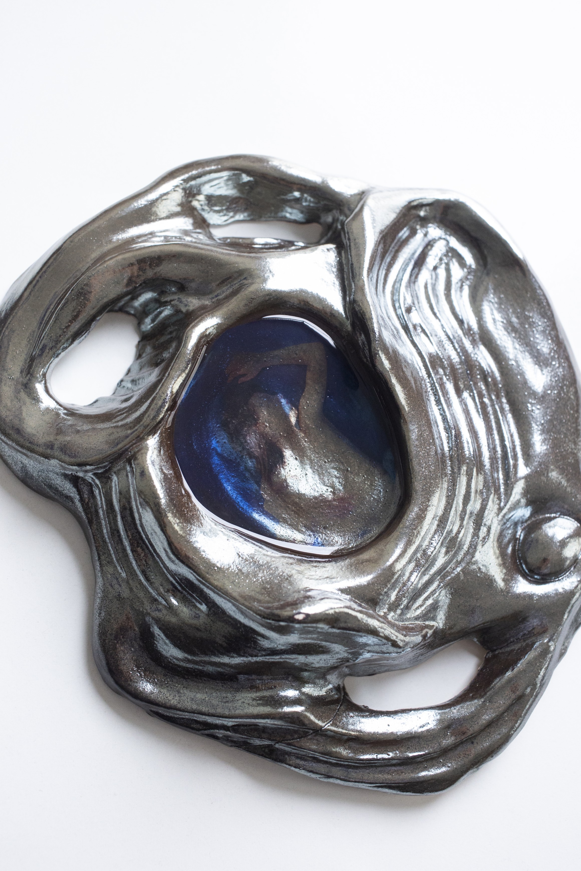 À l’intérieur de la boutique, cette interaction entre lumière et matière devient une manifestation visuelle du dialogue entre l’intérieur et l’extérieur, le soi et l’autre. L’intérieur de la boutique reflète l’univers imaginatif de l’artiste, un espace peuplé de fragments de photographies, de éclaboussures de peinture et de matériaux tactiles qui incarnent le processus créatif de Poncin. Ses céramiques, présentant des figures féminines allongées et oniriques, trouvent leur place au sein de cette harmonie chaotique, invitant les spectateurs à interagir avec l’imagerie superposée.